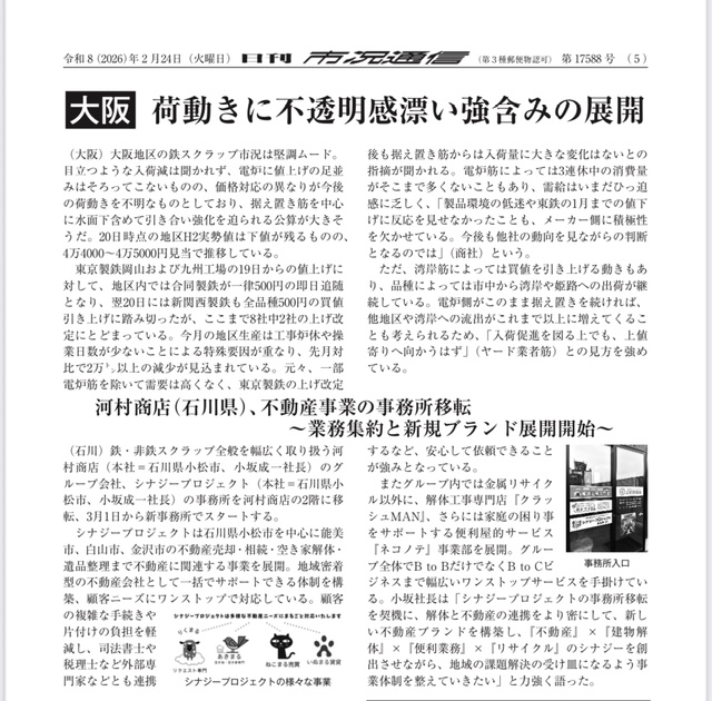 2026.02.26このたび、株式会社シナジープロジェクトは「日刊市況通信」にて、不動産市場・建物解体・不用品回収・金属リサイクル業界の最新動向をテーマとした記事連載・取材を受けました。